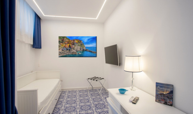 La Camera Amalfi è una camera per 2 persone con un letto matrimoniale. La camera offre tutti i comfort quali la tv, l’aria condizionata, il riscaldamento e il frigorifero. Offriamo un colazione convenzionata con il Bar a due minuti dalla struttura.