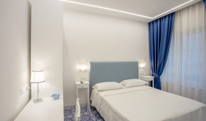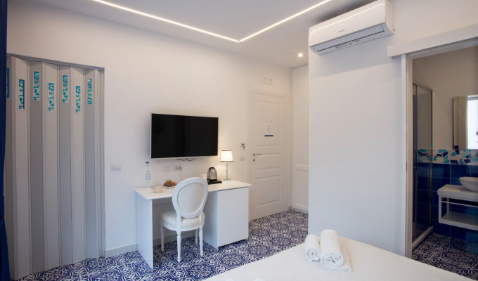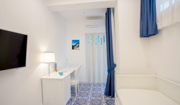 La Camera Positano può ospitare fino a 4 persone, infatti dispone di un letto matrimoniale e due letti singoli. La camera possiede anche un balcone privato dove potersi rilassare e offre tutti i comfort quali la tv, l’aria condizionata, il riscaldamento, il frigorifero e il bollitore. Nel prezzo è compreso il Wi-Fi. Offriamo un colazione convenzionata con il Bar a due minuti dalla struttura. Le tende della stanza sono in tessuti ignifughi (Tutto Made in Italy). E' presente un bagno grande con doccia e phon già presente. Supplemento letto extra su richiesta.